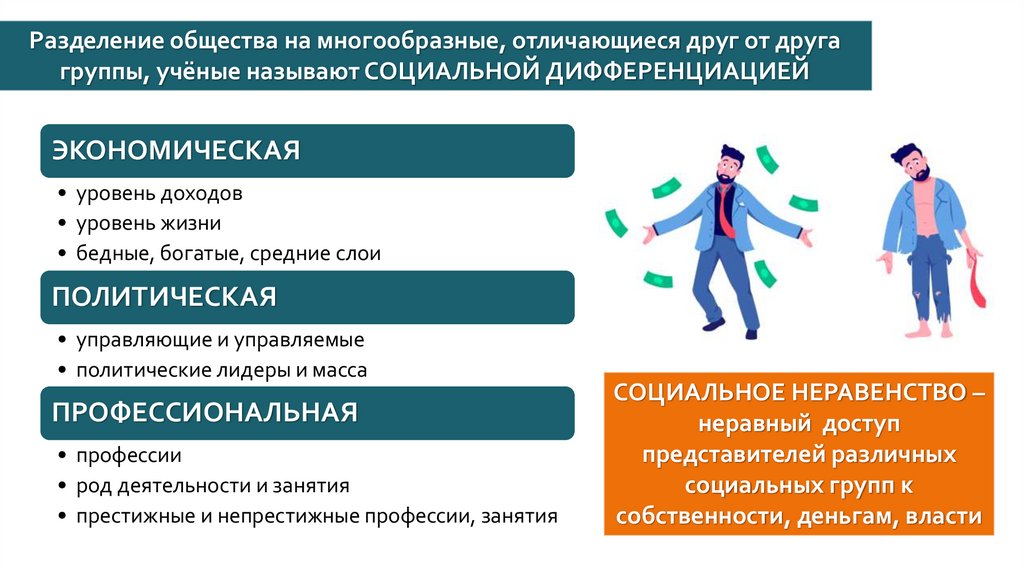 Разделение общества на многообразные, отличающиеся друг от другагруппы, учёные называют СОЦИАЛЬНОЙ ДИФФЕРЕНЦИАЦИЕЙ