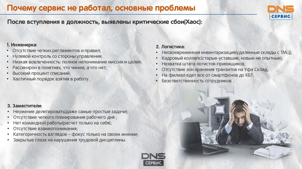 Почему сервис не работал, основные проблемыПосле вступления в должность, выявлены критические сбои(Хаос):
