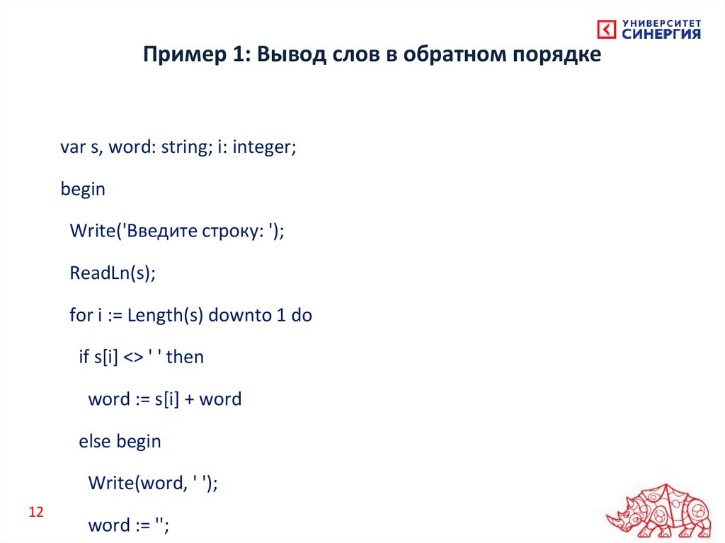 Пример 1: Вывод слов в обратном порядкеvar s, word: string; i: integer;