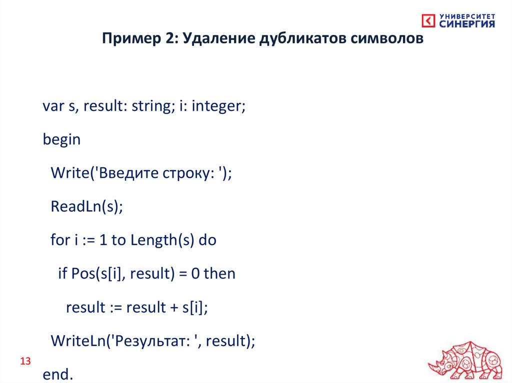 Пример 2: Удаление дубликатов символовvar s, result: string; i: integer;
