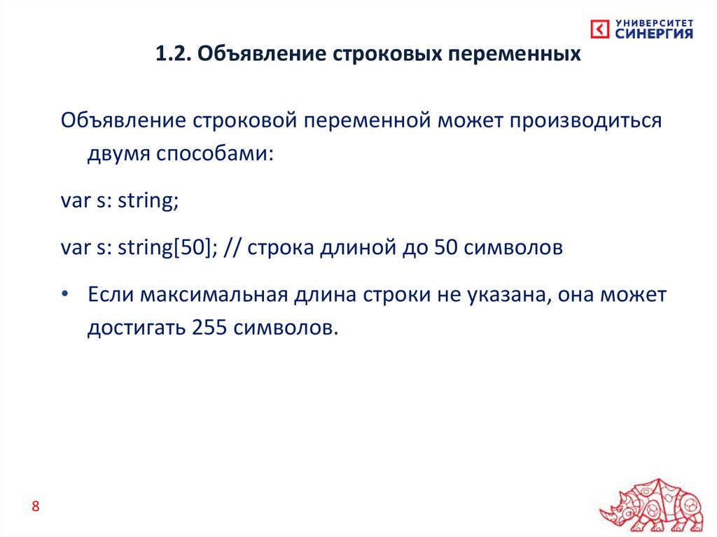 1.2. Объявление строковых переменныхОбъявление строковой переменной может производиться