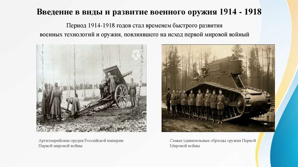 Введение в виды и развитие военного оружия 1914 - 1918Период 1914-1918 годов стал временем быстрого развития