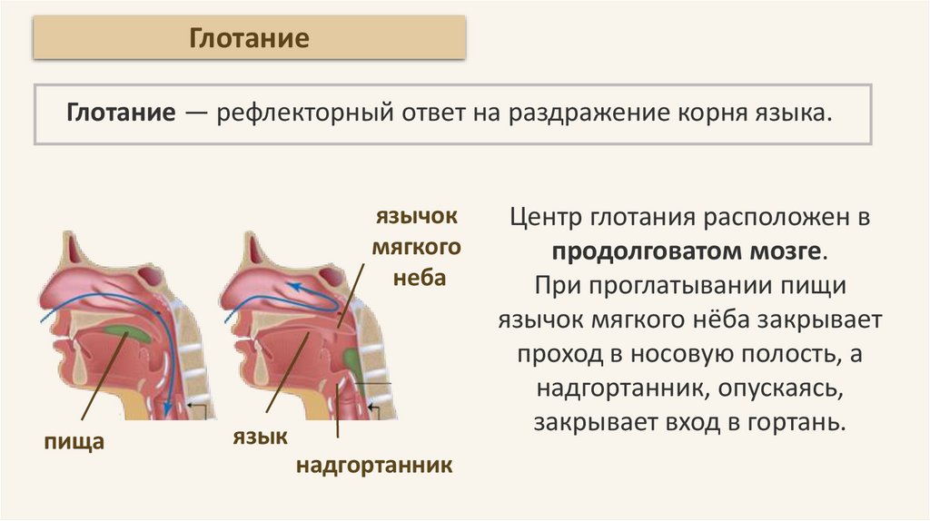 ГлотаниеГлотание — рефлекторный ответ на раздражение корня языка.