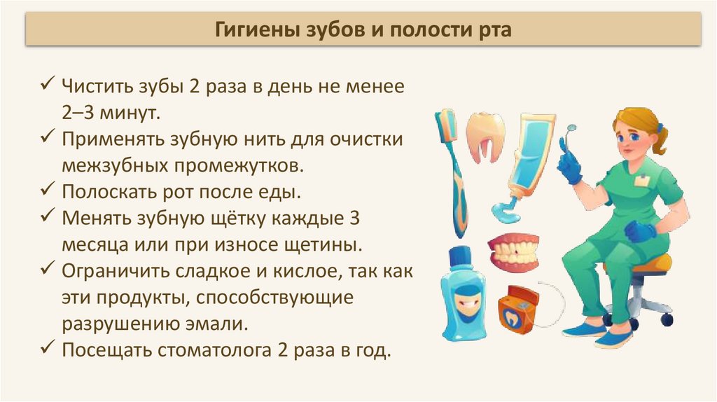 Гигиены зубов и полости ртаЧистить зубы 2 раза в день не менее