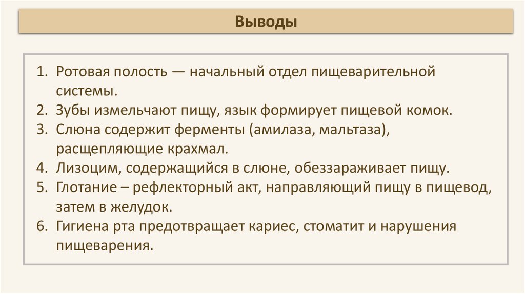Выводы1. Ротовая полость — начальный отдел пищеварительной