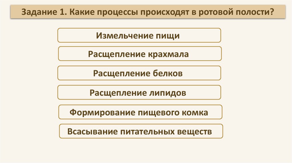 Задание 1. Какие процессы происходят в ротовой полости?Измельчение пищи
