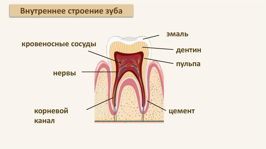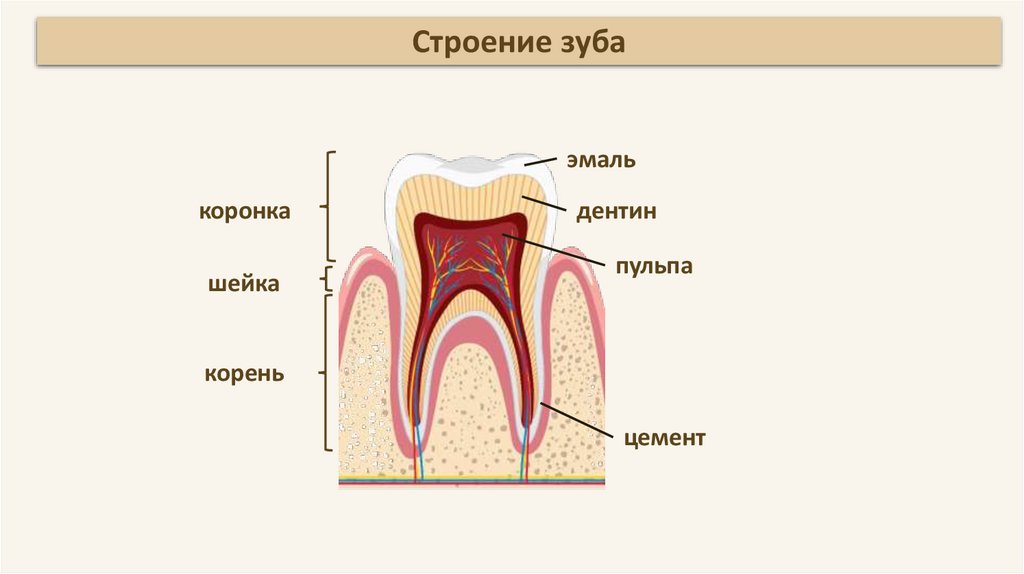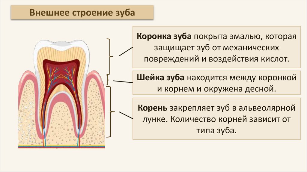 Внешнее строение зубаКоронка зуба покрыта эмалью, которая