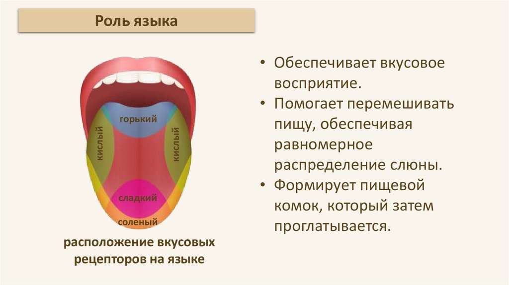 2. Зубы измельчают пищу, язык формирует пищевой комок.