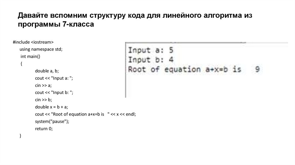 Давайте вспомним структуру кода для линейного алгоритма изпрограммы 7-класса
