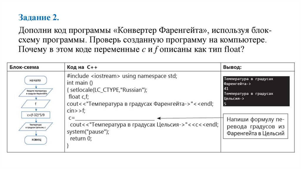 Задание 2.Дополни код программы «Конвертер Фаренгейта», используя блоксхему программы. Проверь созданную программу на компьютере.