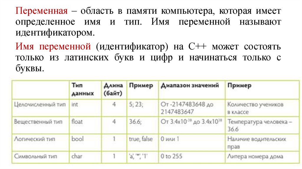 Переменная – область в памяти компьютера, которая имеетопределенное имя и тип. Имя переменной называют