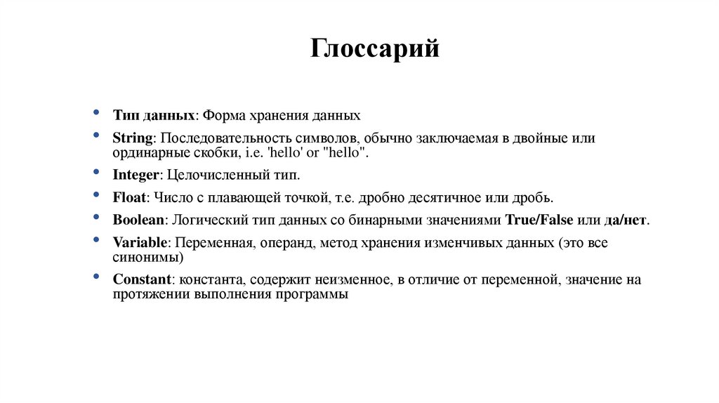 Boolean: Логический тип данных со бинарными значениями True/False или да/нет.