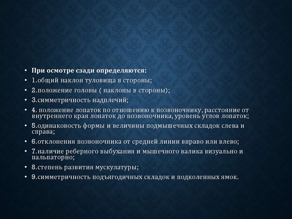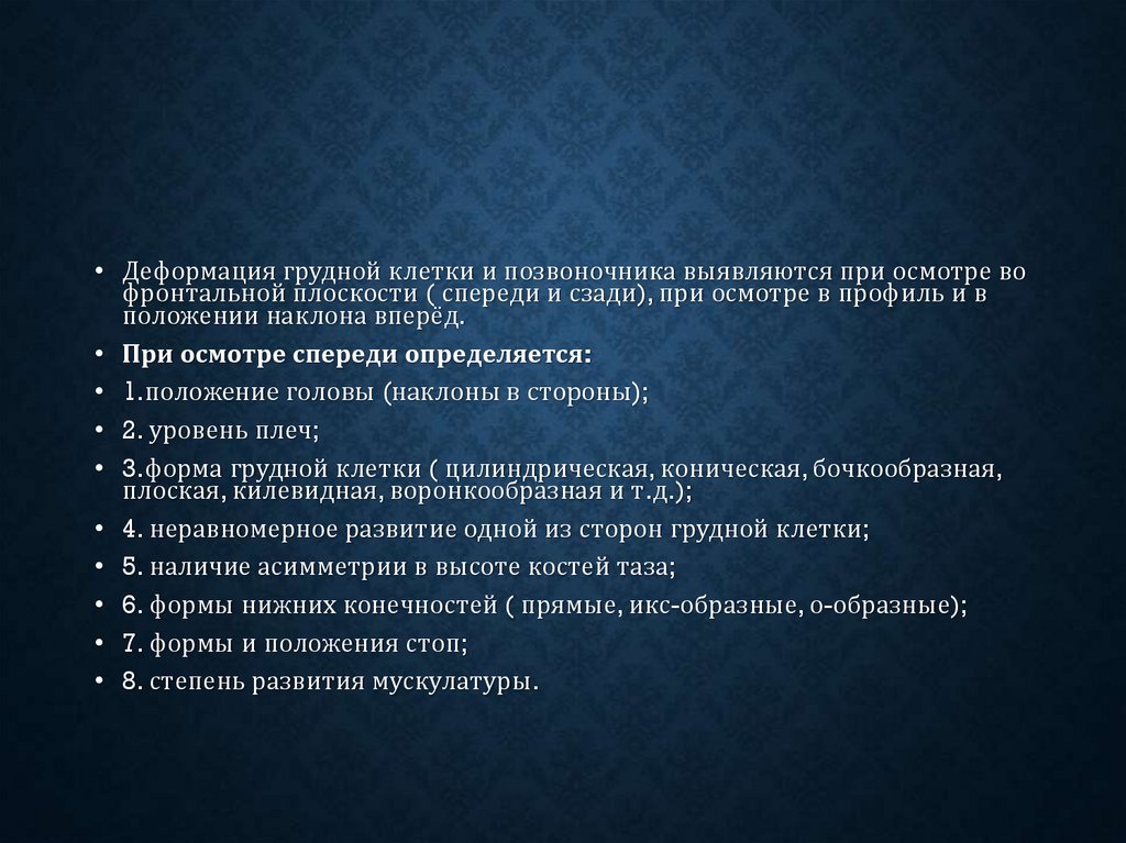 • Деформация грудной клетки и позвоночника выявляются при осмотре вофронтальной плоскости ( спереди и сзади), при осмотре в профиль и в