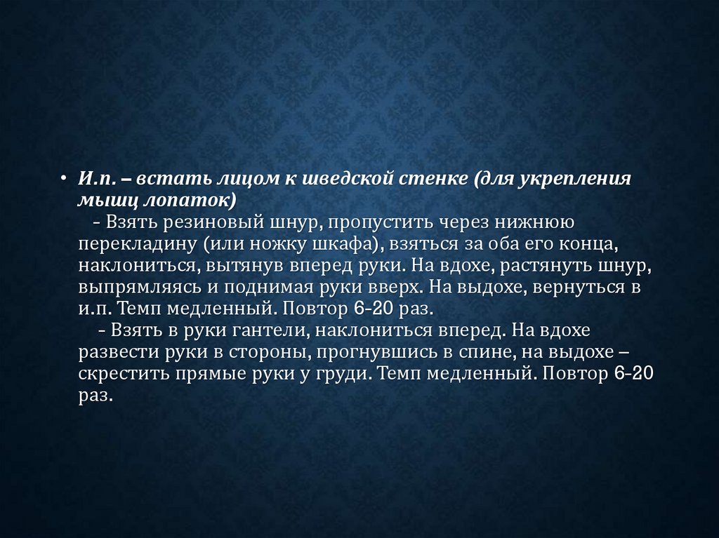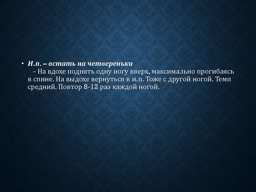 в стороны 5-10 сек. На выдохе вернуться в и.п. Темп средний.