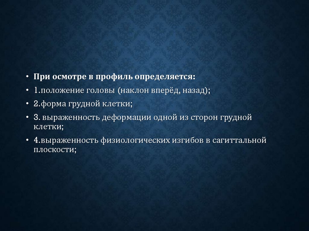 • При осмотре в профиль определяется:• 1.положение головы (наклон вперёд, назад);