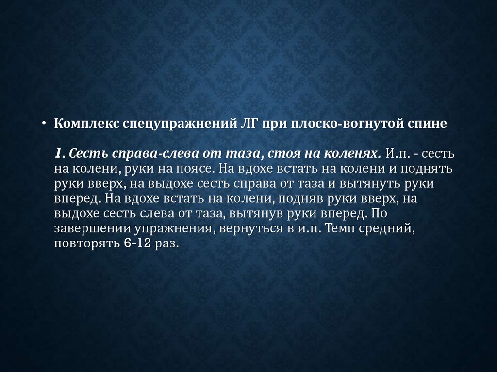 • Комплекс спецупражнений ЛГ при плоско-вогнутой спине1. Сесть справа-слева от таза, стоя на коленях. И.п. - сесть
