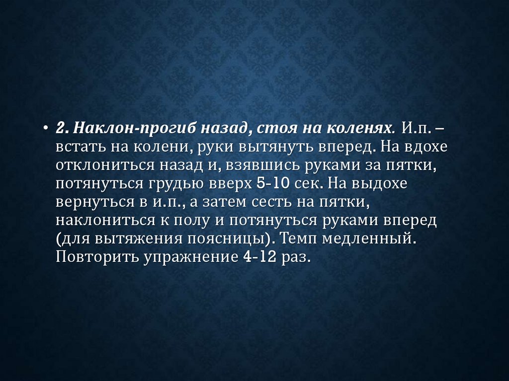 • 2. Наклон-прогиб назад, стоя на коленях. И.п. –встать на колени, руки вытянуть вперед. На вдохе