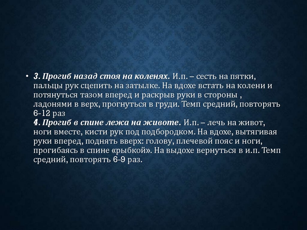 • 3. Прогиб назад стоя на коленях. И.п. – сесть на пятки,пальцы рук сцепить на затылке. На вдохе встать на колени и