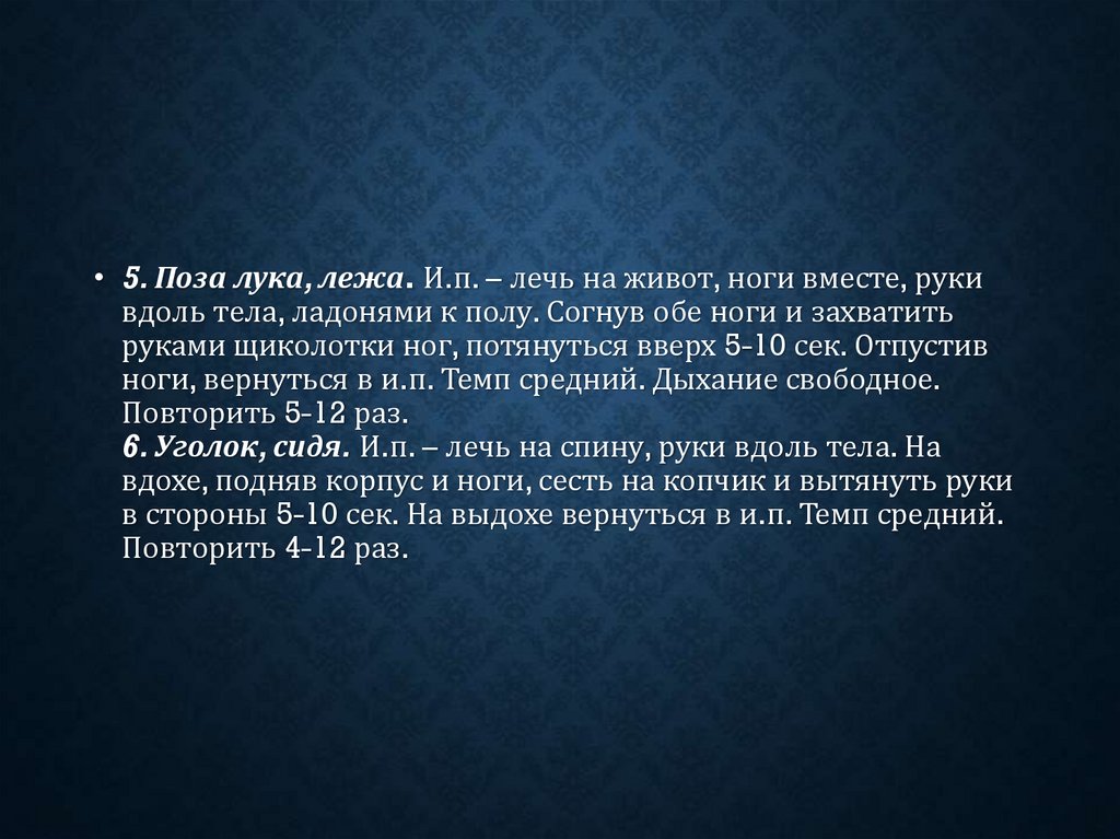 • 5. Поза лука, лежа. И.п. – лечь на живот, ноги вместе, рукивдоль тела, ладонями к полу. Согнув обе ноги и захватить