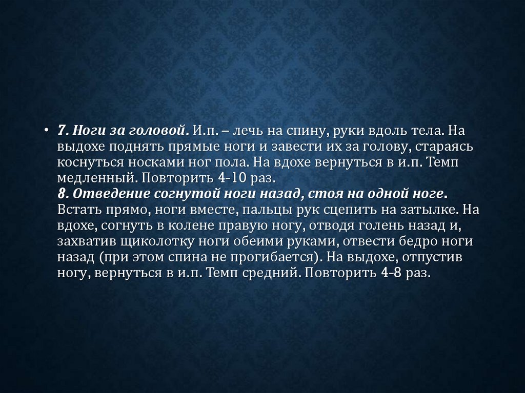 • 7. Ноги за головой. И.п. – лечь на спину, руки вдоль тела. Навыдохе поднять прямые ноги и завести их за голову, стараясь