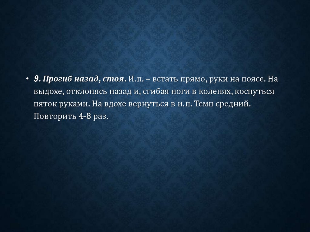 • 9. Прогиб назад, стоя. И.п. – встать прямо, руки на поясе. Навыдохе, отклонясь назад и, сгибая ноги в коленях, коснуться