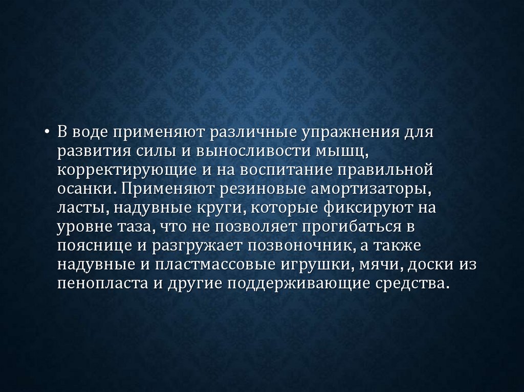 • В воде применяют различные упражнения дляразвития силы и выносливости мышц,