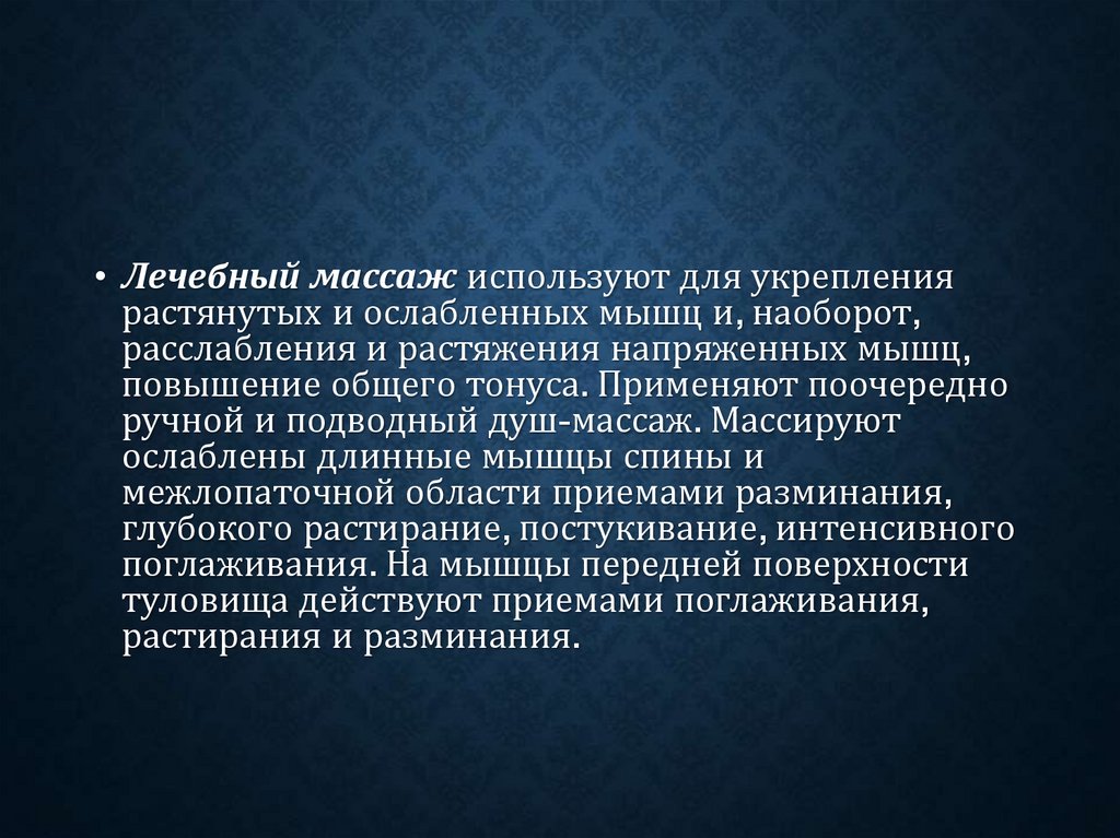 • Лечебный массаж используют для укреплениярастянутых и ослабленных мышц и, наоборот,