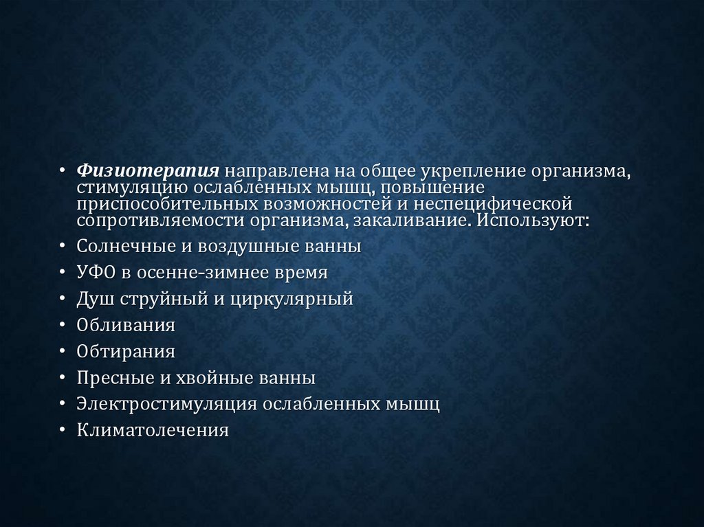 • Физиотерапия направлена на общее укрепление организма,стимуляцию ослабленных мышц, повышение