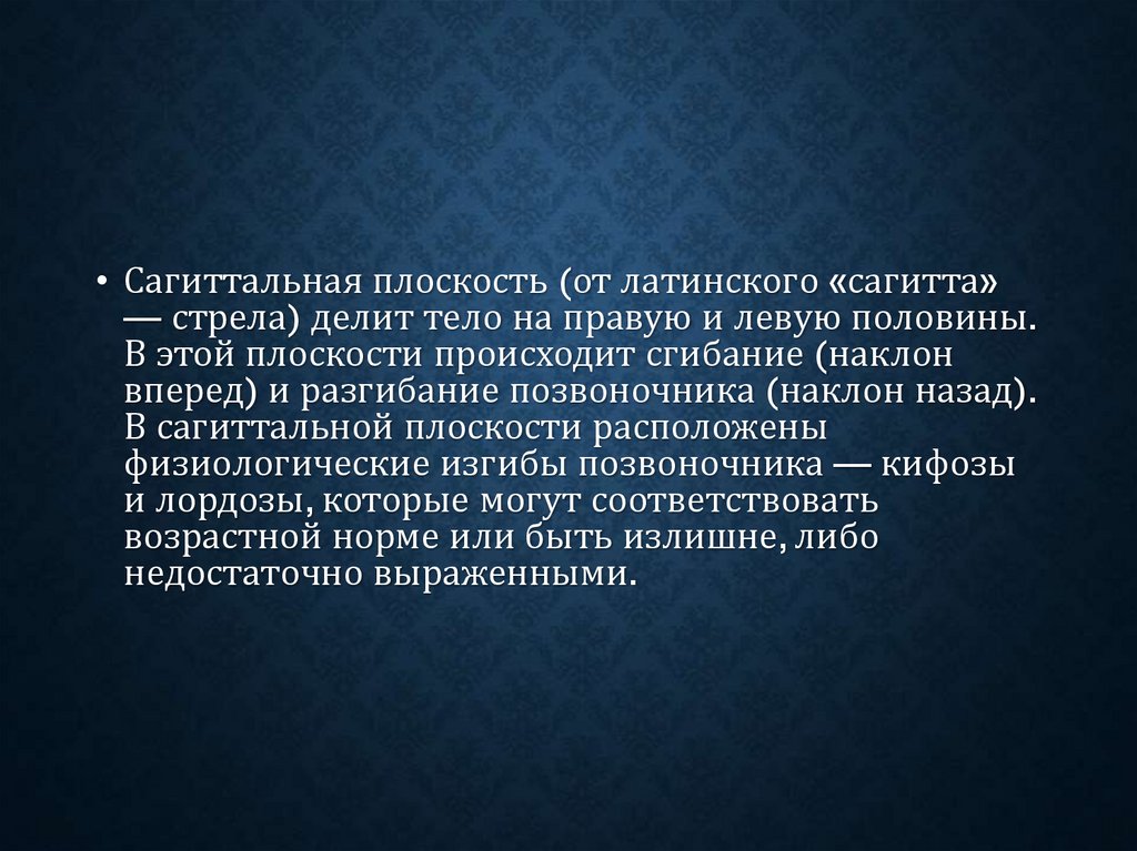 • Сагиттальная плоскость (от латинского «сагитта»— стрела) делит тело на правую и левую половины.