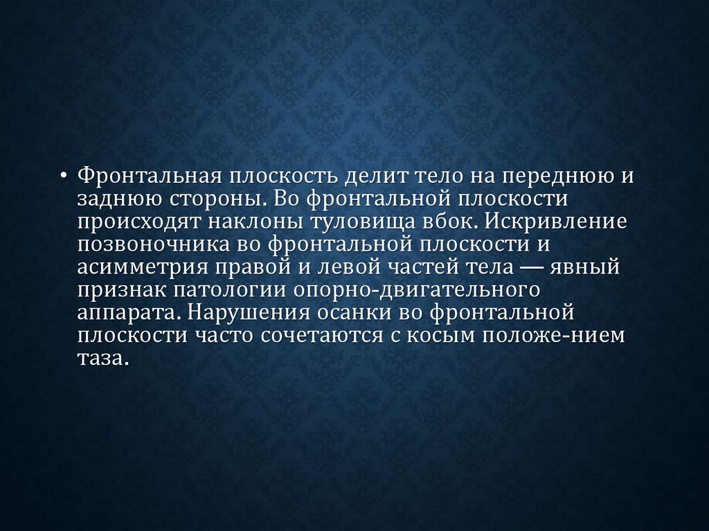 • Фронтальная плоскость делит тело на переднюю изаднюю стороны. Во фронтальной плоскости