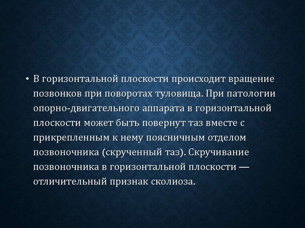 • В горизонтальной плоскости происходит вращениепозвонков при поворотах туловища. При патологии