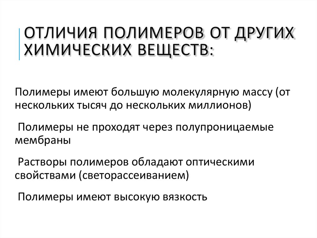 ОТЛИЧИЯ ПОЛИМЕРОВ ОТ ДРУГИХХИМИЧЕСКИХ ВЕЩЕСТВ: