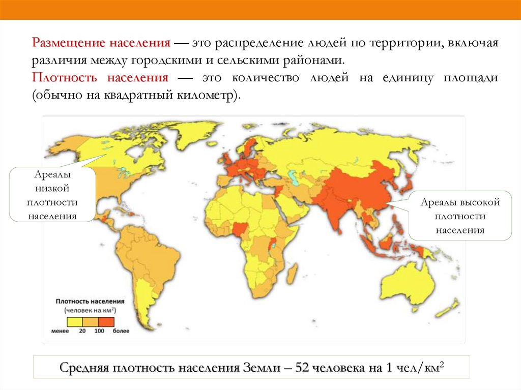Средняя плотность населения Земли – 52 человека на 1 чел/км2