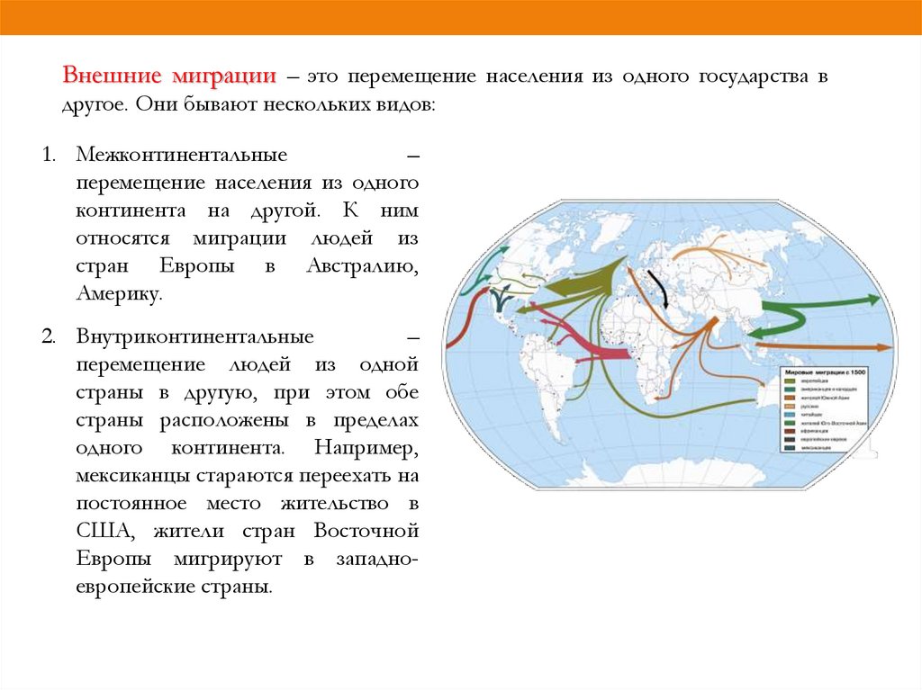 Внешние миграции – это перемещение населения из одного государства вдругое. Они бывают нескольких видов: