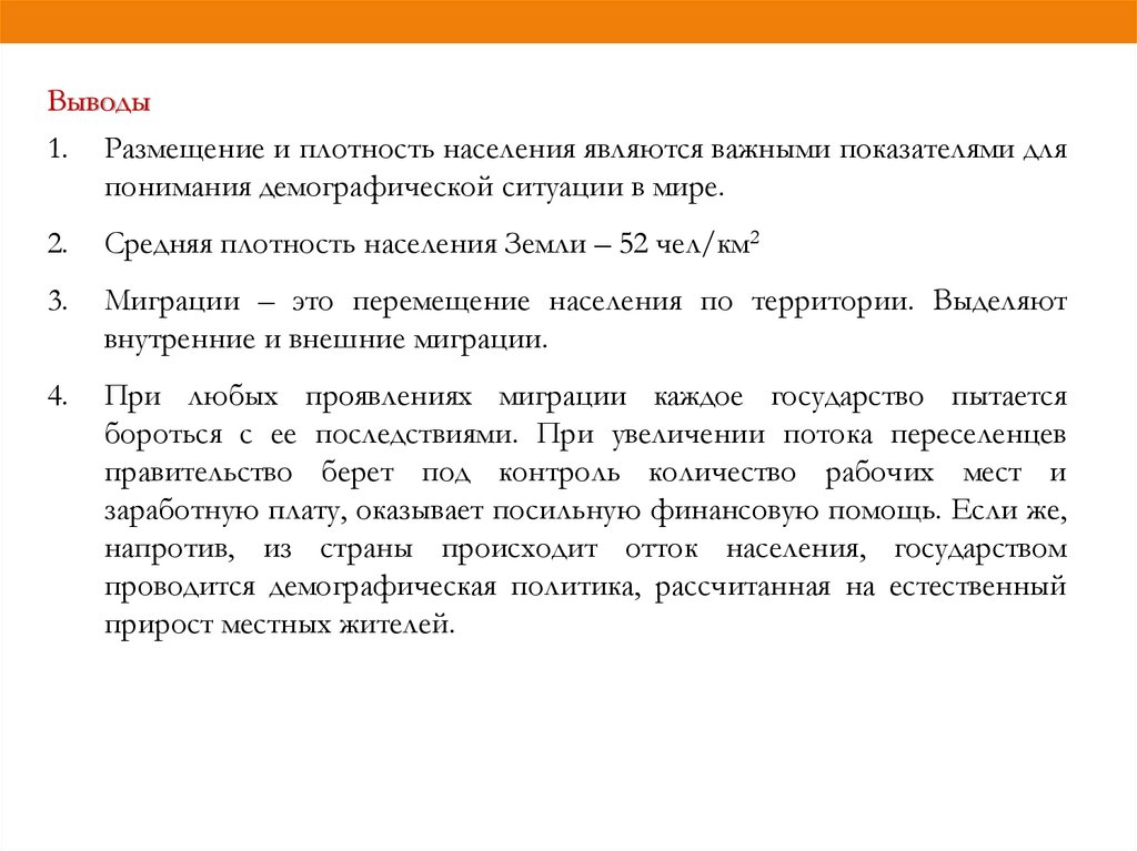 Выводы1. Размещение и плотность населения являются важными показателями для