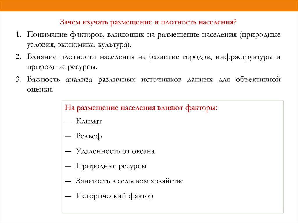 Зачем изучать размещение и плотность населения?1. Понимание факторов, влияющих на размещение населения (природные
