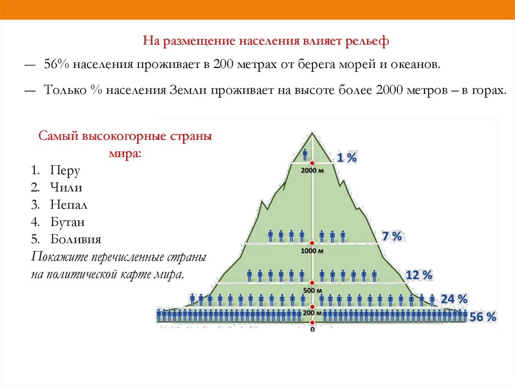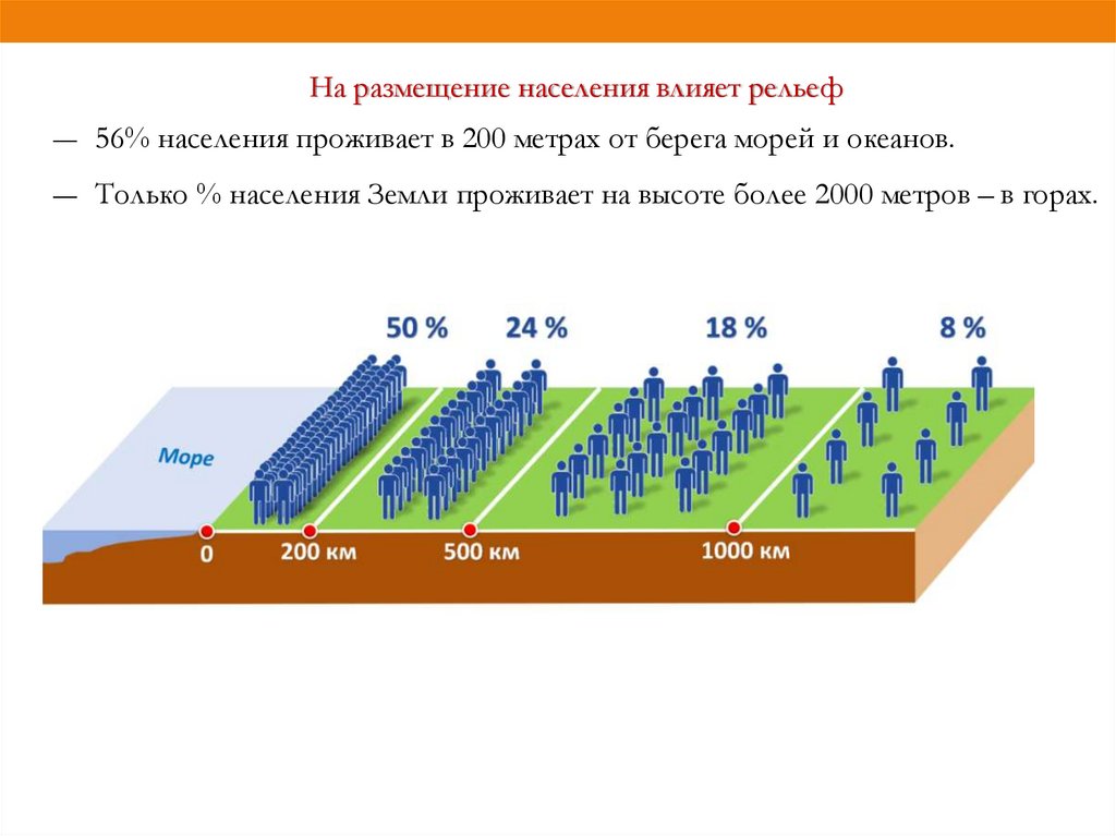 На размещение населения влияет рельеф― 56% населения проживает в 200 метрах от берега морей и океанов.