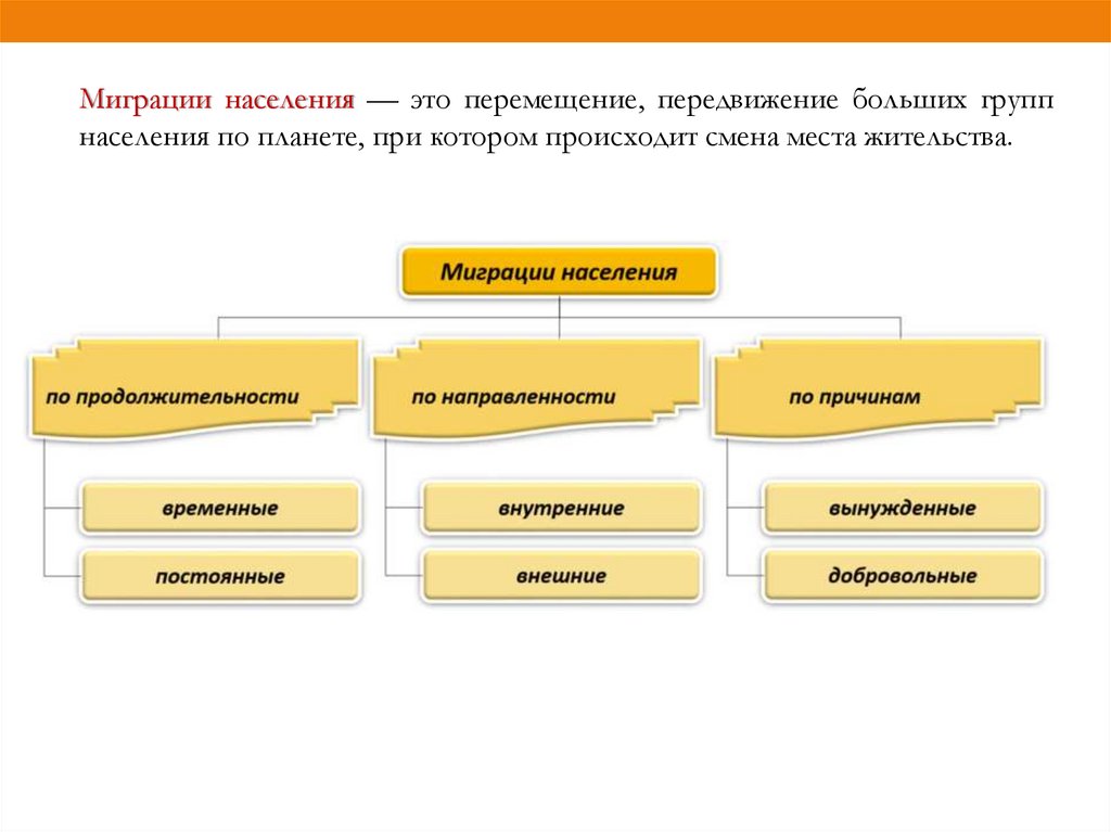 Миграции населения — это перемещение, передвижение больших группнаселения по планете, при котором происходит смена места жительства.