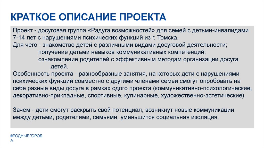 КРАТКОЕ ОПИСАНИЕ ПРОЕКТАПроект - досуговая группа «Радуга возможностей» для семей с детьми-инвалидами