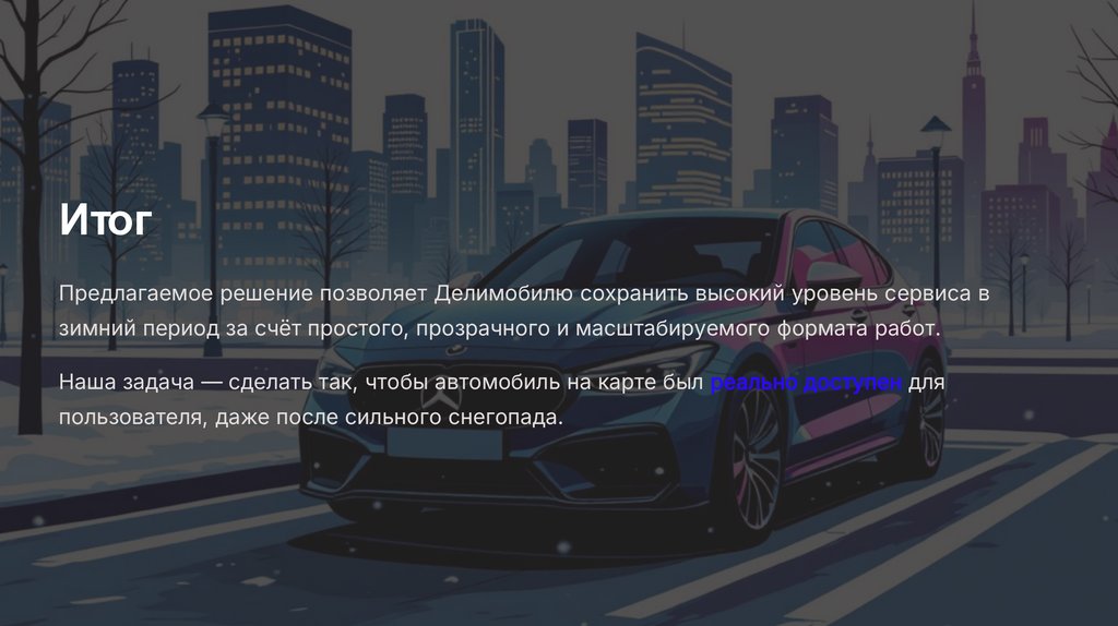 ИтогПредлагаемое решение позволяет Делимобилю сохранить высокий уровень сервиса в