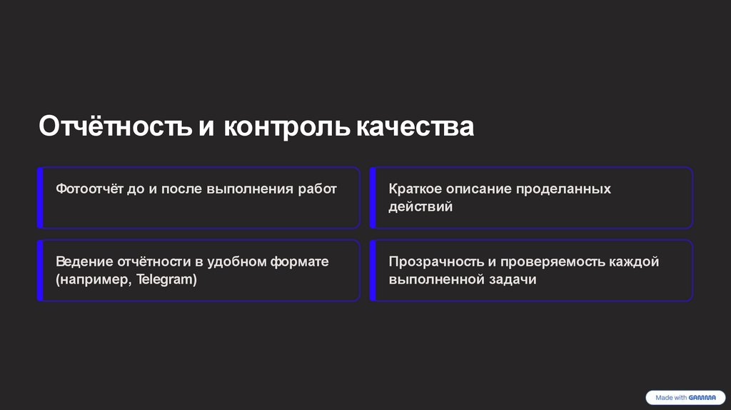 Отчётность и контроль качестваФотоотчёт до и после выполнения работ
