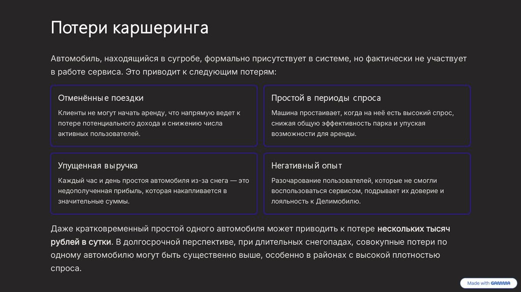 Потери каршерингаАвтомобиль, находящийся в сугробе, формально присутствует в системе, но фактически не участвует