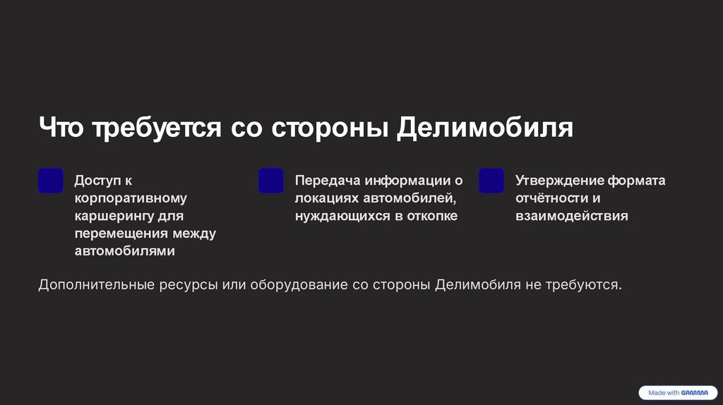 Дополнительные ресурсы или оборудование со стороны Делимобиля не требуются.