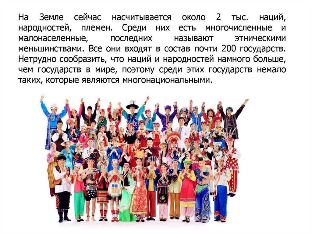На Земле сейчас насчитывается около 2 тыс. наций,народностей, племен. Среди них есть многочисленные и