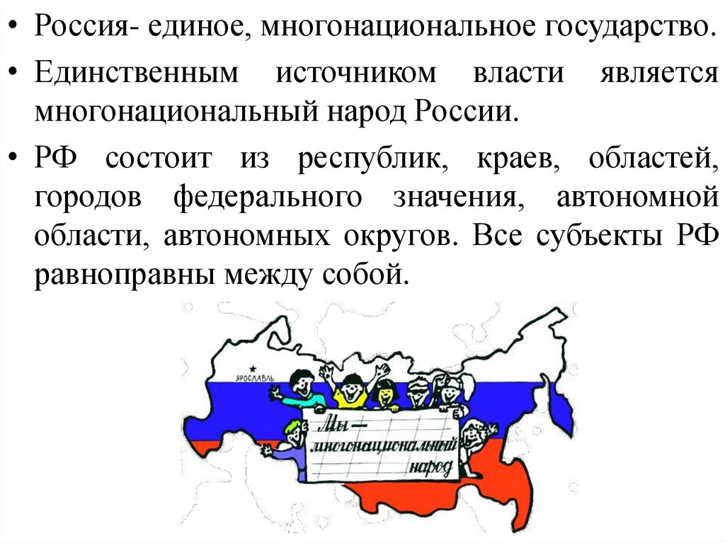 • Россия- единое, многонациональное государство.• Единственным источником власти является