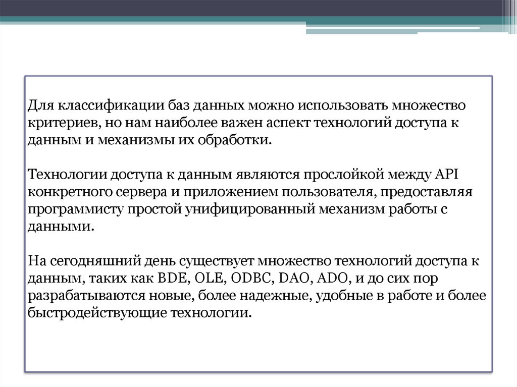Для классификации баз данных можно использовать множествокритериев, но нам наиболее важен аспект технологий доступа к