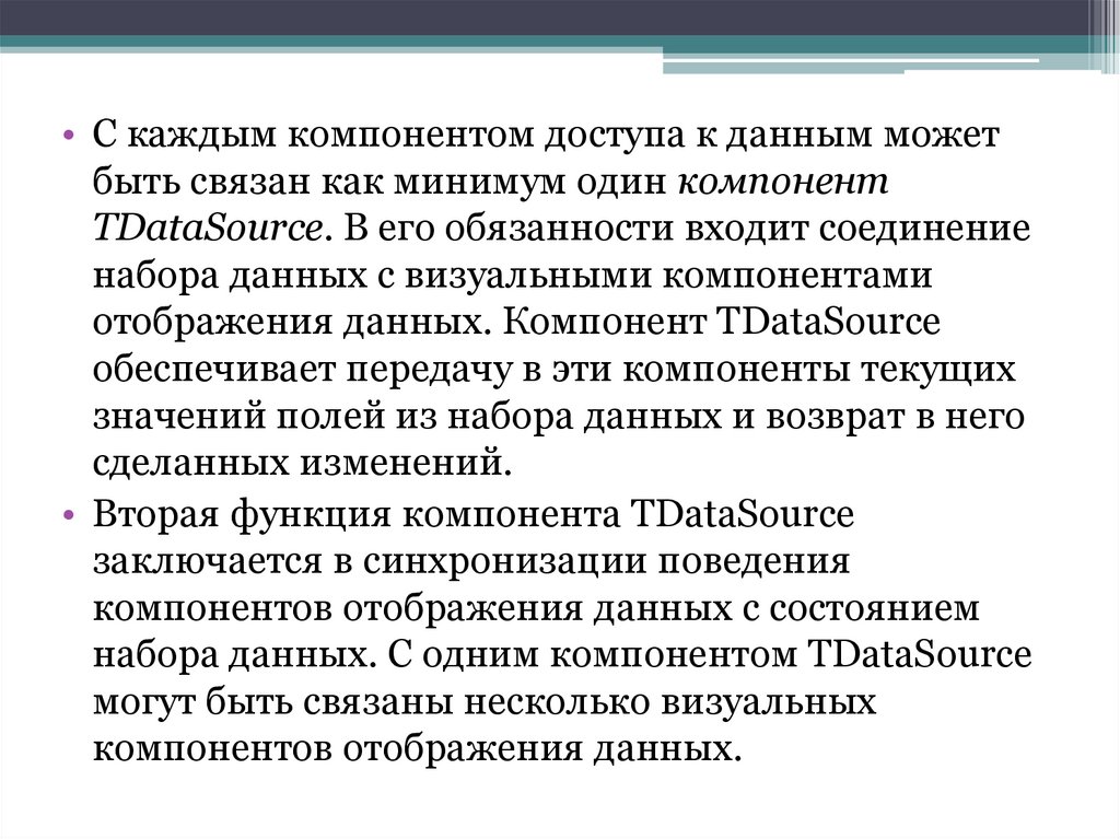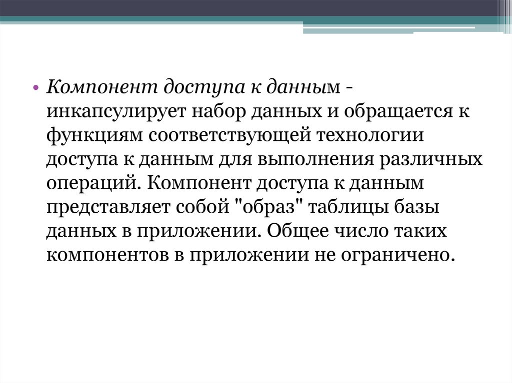 • С каждым компонентом доступа к данным можетбыть связан как минимум один компонент