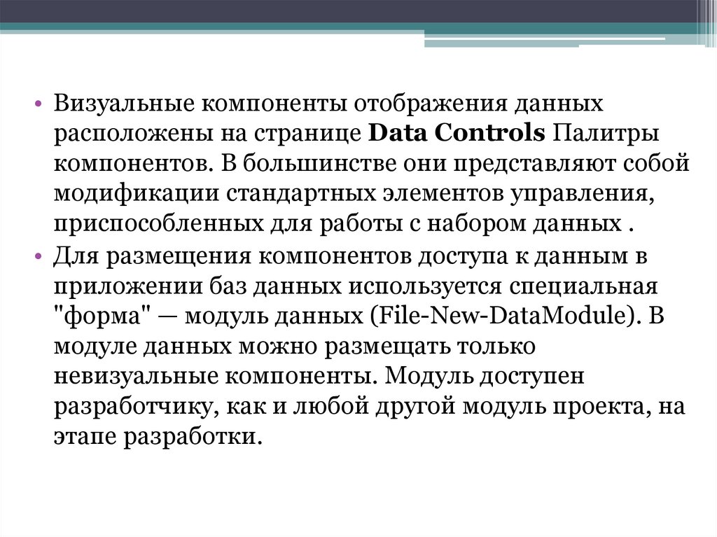 • Визуальные компоненты отображения данныхрасположены на странице Data Controls Палитры
