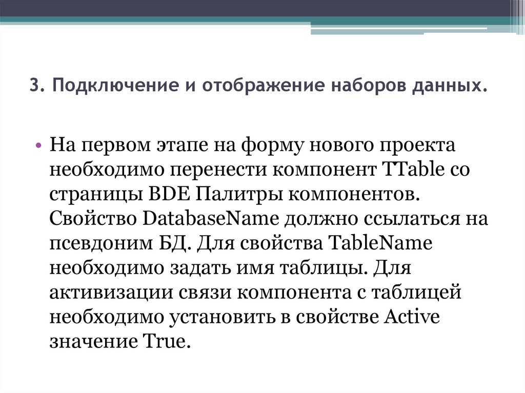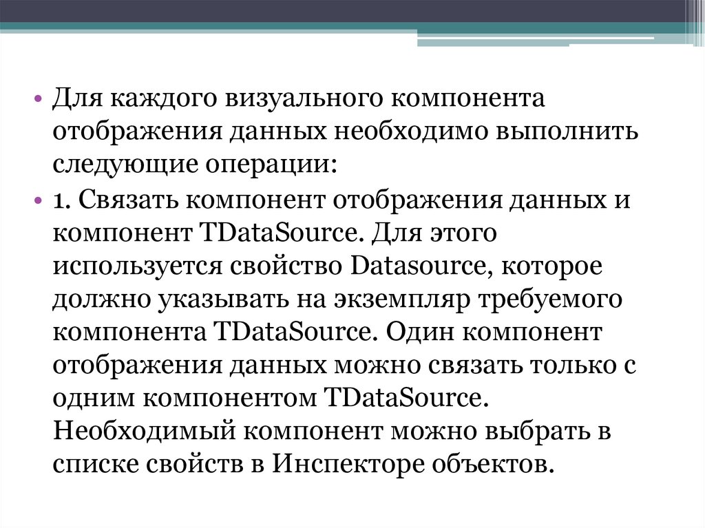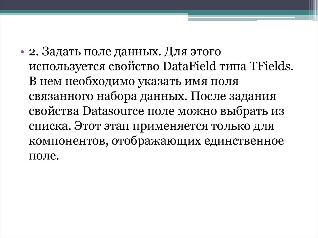 • 2. Задать поле данных. Для этогоиспользуется свойство DataField типа TFields.