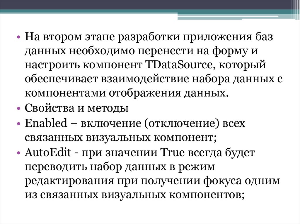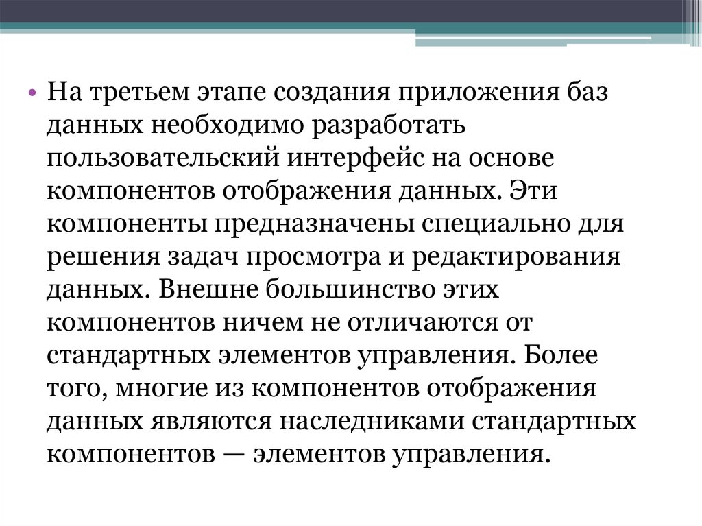 • На втором этапе разработки приложения базданных необходимо перенести на форму и